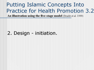 entry point into the 2nd stage of Bracht et al. (1999) five-stage model. Reference: Bracht, N., Kingsbury, L. & Rissel L. (1999). A Five stage Community Organization Model for Health Promotion. In Bracht, N (Ed.). Health Promotion at the community Level. (pp 83-104). International Educational and Professional Publisher, Thousand Oaks, California 91320. SAGE Publications Hussein, A. A. (1998). The art of health promotion in Islam and the contemporary public health challenges, MPH Thesis. Maastricht. University of Maastricht. |