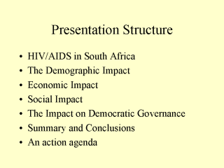 | The presentation aims to show that HIV/AIDS is not just a health problem – that every facet of society, and every sector will be affected by the pandemic. We are already seeing this impact on a number of levels – this lecture takes students through these impacts – both current and projected - on society, on the demography of the country, and on the economy. The details of the impact at each level (individual, household, labour market, firm/sector, government) are described in slides 13 to 17. |