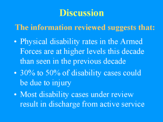 Data from the Army, Navy, and Air Force disability agencies were reviewed to identify the possible impact of injury-related disability in the Armed Forces, and to examine the usefulness of the databases for injury surveillance. A number of observations were noted from this effort. They are outlined in the following two slides.