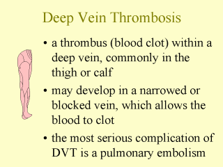 blocked vein which increases the risk for clotting. The complication of urgent concern with deep vein thrombosis is the onset of a pulmonary embolism, brought on by the blot clot traveling from the leg vein to the lung (where it subsequently blocks an artery). Many of the recent deaths from air travel have been through a pulmonary embolus. See: Deep Vein Thrombosis. British United Provident Association (BUPA). |
