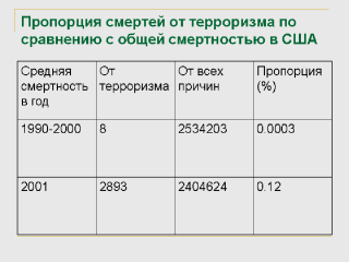 Акты терроризма эпизодичны. Обычно смерть в результате террористических актов является всего лишь маленькой пропорцией по отношению ко всей смертности. Когда происходят серьезные теракты, как в 2001 году, риск смертности может намного возрасти. Total International Terrorist Attacks, 1981-2000. Department of State Publication, Office of the Secretary of State, Released by the Office of the Coordinator for Counter terrorism, April 2001. В интернетеNational Vital Statistics Report, Vol.49 No. 12, Oct 9, 2001 National mortality data: |