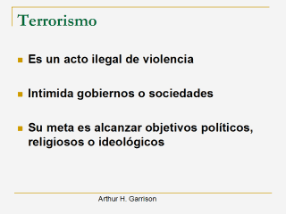 un acto político diseñado por grupos que quieren que su mensaje se escuche. Arthur H. Garrison, How the World Changed: a History of the Development of Terrorism, presented at Delaware criminal Justice Council Annual Retreat, Oct 28-29, 2001 |