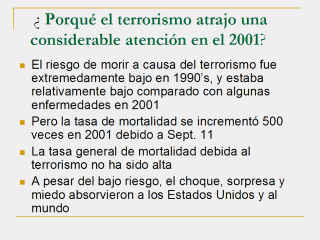| El riesgo de morir por terrorismo fue incluso mas bajo que por ser alcanzado por un relámpago. Asuma cuan sorprendido usted estaría, si alguien le dice que su probabilidad de ser alcanzado por un relámpago seria tan alta como de sufrir un homicidio. |