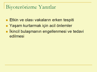 | Biyoterörizme farklı biçimlerde saldırılabilir. Halk sağlığı bakış açısıyla, saldırıya ilk yanıt ilk vakanın görülmesiyle başlatılabiliyor. Ancak mevzuat değişikliğiyle, önlemin saldırının başlamasından önceki zamanlara geri çekilmesi gerektiğine ilişkin görüşler de bulunmaktadır. Örneğin, bu basitce uçuş dersi alıp, uçağı piste indirme konusunda eğitim almaya hevesli olmayan kişilerin tepiti ya da internetten Şarbon (Anthrax) mikrobu satın almak isteyen birisinin yakalanması biçiminde olabilir. |