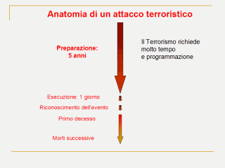 L’attentato terroristico dell’11 settembre è stato preparato per quasi 5 anni prima dell’attacco finale. Il tempo fra l’attacco e il primo decesso è tipicamente breve. P.es., se dovesse esplodere un ordigno nucleare, le morti avverrebbero nel giro di pochi secondi. Voglianmo riuscire a intervenire per evitare ai nostri bambini e a tutti l’esperienza di un attacco terroristico con i suoi morti. |