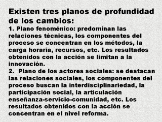 3. Plano estructural: tiene mayor expresión las relaciones políticas, los componentes del proceso se concentran en la articulación estudio-trabajo, el carácter intersectorial, el control social, etc. Los resultados obtenidos con la acción corresponden a una transformación.