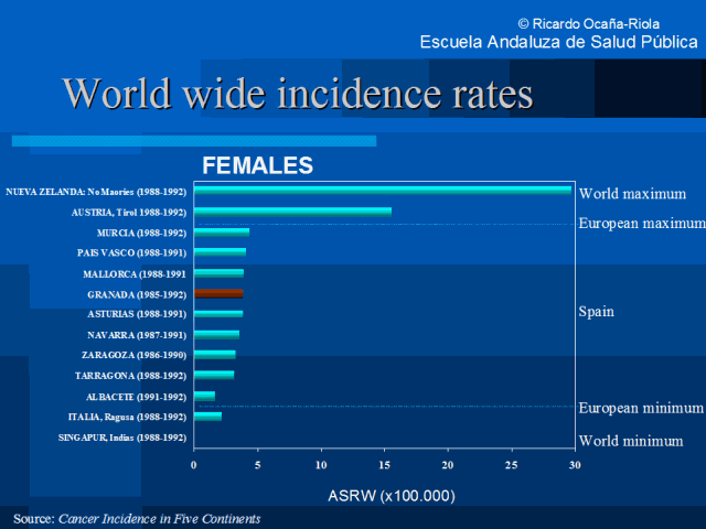The highest incidence rates for females world-wide are those of New Zealand’s non Maori population, the majority of whom are of European origin [5]. Different case-control studies have confirmed the important role of skin phenotype. Risk for melanoma has been associated with several indicators of fair coloring and with an ethnic background related to historically lighter pigmented populations. Blue eyes colour, blonde hair, fair complexion, tendency to sunburn and intermittent sun exposure have been detected as important factors associated with a greatest risk of Cutaneous Malignant Melanoma [15-17; 19]. |