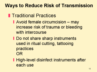 | Although the degree of risk in transmitting HIV with traditional practices is unknown, female circumcision should be avoided, because it may increase the risk of sexual transmission or acquisition of HIV due to increased trauma and bleeding with sexual intercourse. Sharp instruments used in ritual cutting or tattooing should not be shared or should be correctly disinfected after each use. |
