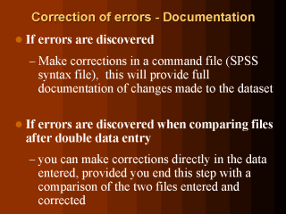| If errors are discovered, do not be tempted to go directly into the data window and correct errors because 1) the risk of “correcting” the wrong variable or case is high; and 2) the change is undocumented and the audit trail is broken. |