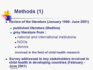 methodology: Firstly a review of the literature to define a picture as complete as possible of the major advancements in child health research since 1990: browsing through all the databases and chose Medline as the most representative. => proceeded by combination of 2 main keywords, child and developing countries with as set of other keywords such as diarrhoeal diseases, breastfeeding. Also compiled grey literature, reports produced by key institutions. Second strategy : perform a survey in order to collect data on the perception of field actors related to child health needs in developing countries and the reality of their research activities. |