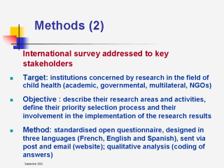universities, national research councils, international institutions, NGOs etc. The aim of the survey was to determine the degree of involvement in child health of these institutions and describe their research activities; the survey was also designed to evaluate the obstacles they meet in implementing the results of their research. Survey tool : standardised trilingual questionnaire. |