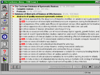 Features of the index window. Lists the individual sections in the Cochrane Library, can be opened up to view the titles of the records in databases.
