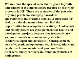 COLOMBIA: Experiences with Youth Organizations Youth organizations from depressed neighborhoods (comunas) of Cali,Colombia are working together to build a better life for themselves and their communities. Their own initiatives to address prioritized problems are the means to gain confidence, self-assurance and to find alternatives of solution to their needs. "Corporacion El PARCHE" is a group of 25 young persons with 5 years experience in working with the following main objective: "To promote their own integral development, increasing cohesion and community sense through cultural and artistic activities". They implemented four lines of action: education, culture, participatory research and social networks formation. Among their achievements are: improved relationships with family and peers; recognition by diverse governmental and non-governmental organizations; support for organizing new youth groups in others comunas; teaching rap music to 40 youngsters, and video design and elaboration to 15 other ;organization of health festivals., The most important of all for them has been recognition by inhabitants of the Comuna, which lead to their inclusion in the Local Planning Committee and to the creation of "El Frente Comun para Jovenes" (The Common Front for Young Peoples). Violence and delinquency rates have been significantly reduced. Mujeres Activas para un Futuro Mejor, MAFUM (Active Women Association for a Better Future). This organization has also 5 years of experience and its objective is : "To work for comprehensive education of women, free and active participation in decision-making on important matters for their community and country".They are young women and men who share needs and wishes. They used the formulation of projects on issues such as sexual and reproductive life, health promotion, citizen culture and environment improvement, as a participatory methodology for their own development. Among their achievements are: negotiation with governmental institutions to obtain financial support; organization of a series of education and training courses in sexual and reproductive health, prevention of drug addiction and domestic violence. MAFUM also participate in the Planning Committee of the Comuna. (Written by Sandra Torres). These two Youth Organizations are supported by FUNDAPS (Fundacion para asesorar Programas de Salud), CISALVA (Research Institute on Violence and Health of University Valle), and Secretary of Health of the City of Cali. |