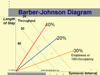 examine its performance over time. The Throughput Contour lines 20, 30 and 60 patients per bed per year will be determined by the Length of Stay. A high Throughput will mean a short length of stay and a short Turn Over Interval.