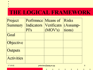 Indicators (P.I.’s) are: 1. Monitoring Tools to measure activities and outputs 2. Evaluation tools to measure whether objectives and goals are achieved They should be SMART and can relate to Input, Process and Outcome Specific Measurable Achievable Realistic Timebound Means of Verification (MOV’s) are the sources of information for verifying that the P.I.'s have been achieved. The Risks to the project need to be considered-short term, will it happen, long term - is it sustainable. Risk can be assessed in terms of Consequences 1-4 and Probability 1-4, the Risk Rating is the multiple of these i.e. Consequences 4 x Probability 4 = Risk rating 16 (very high). |