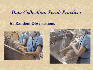 | e) Finally, we made 61 random observations of each of the scrub methods over the length of the study period. We observed the scrub technique and recorded the time required for HP and the traditional scrub and we also recorded whether or not the protocol for each product was being followed. |