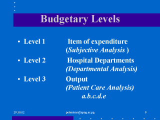 Manpower,Goods and services Level 2 - Departments Level 3 - Patient care Analysis a. Broad client group…….Mental Illness, Sugery b. Clinical Specialty……..Psychotherapy, Orthopaedics c. Consultant-clinical team….Dr.Jones/ Team A d. Disease category…………Fractured neck of femur e. Individual patient………..Mrs. Smith, Clinical cameo Mrs Smith is an 89 year old woman, she lives with her daughter in her own home. She has good health. She sustained a fall on 31st December when she tripped over a loose carpet.This resulted in a fractured neck of femur. She was admitted under Orthopaedics Team A on 1st January 2002 as an emergency, operated upon on 2nd January with Pin and plate. Discharged walking and partly weight bearing on 12th January 2002 to a Residential home for six weeks and to return to her own home thereafter. |
