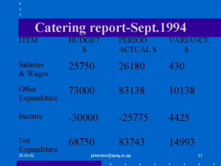 one month of spending by a catering department. During this month there has been overspending on salaries, other expenditure e.g provisions, while income from meals sold to staff has also gone down. Overall expenditure in this month is greater than the budget for that month and the budget is net overspent. If this continues the overall budget for the year will be overspent. It is possible that the extra cost of provisions in one month may be because there have been several large bulk purchases. The decrease in income may be because there have been many staff away on holiday. |