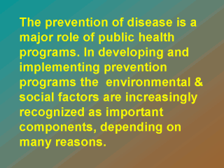 | The role of environmental factors is based on the fact that many diseases of concern involve large number of people and that is it is more cost-effective to prevent such diseases at an environmental level than at a “one to one” individual level. |