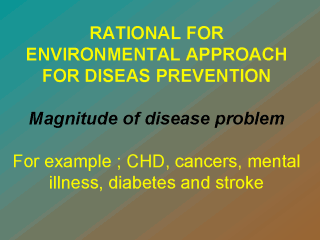 | Considering CHD, a disease which could be easily combated through different factors, i.e. smoking, overweight, atherosclerosis. Although one to one approach to disease of great prevalence clearly is of value to patients, and families, it dose a little to alter the distribution of the disease in the population because new people will develop the disease. Thus individual approach exhaust medical care resources and environmental approach is clearly more efficient. |