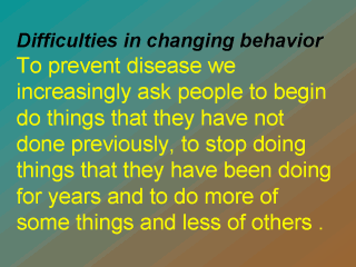 | Changing behavior and attitude of people is a very difficult complex , especially when many forces in the social, cultural and physical environment conspire against such change. Although many diseases can treated by injection or surgery, most chronic diseases and conditions such as cancers, CVD, Cirrhosis and chronic respiratory diseases, are associated to a greater or lesser degree with particular behavior. i.e. cigarette smoking programs. |
