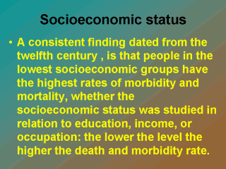 | There are two explanations for that importance of socioeconomic status. One is that it is a so powerful risk factor that we always statistically control for its influence, So it is rarely studied as a phenomenon in its own right. The second is that socioeconomic status is not amenable to intervention as other factors do, smoking, diet. |