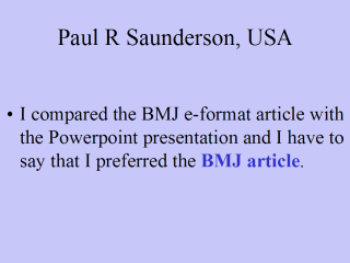However, my main complaint is the problem with sound and bandwidth on the Internet. I am in the US, with a broadband connection, but during peak hours (4pm) the PP presentation was still annoyingly slow. I have had a very frustrating time with streaming audio on my computer, which is admittedly rather old. I cannot get Real player to work at all, but I can listen to some audio pieces - on the other hand, at home, Real player works well, but some others do not. I consider myself a very average internet user, with no great computer skills, but it seems to me that online learning will not take off until this whole issue is tackled. I understand that the Adobe Acrobat format is the universally accepted standard for document transmission and this works well - surely we need something analogous for sound and/or multimedia files? My point is that until this becomes more user-friendly it cannot be used world-wide. |