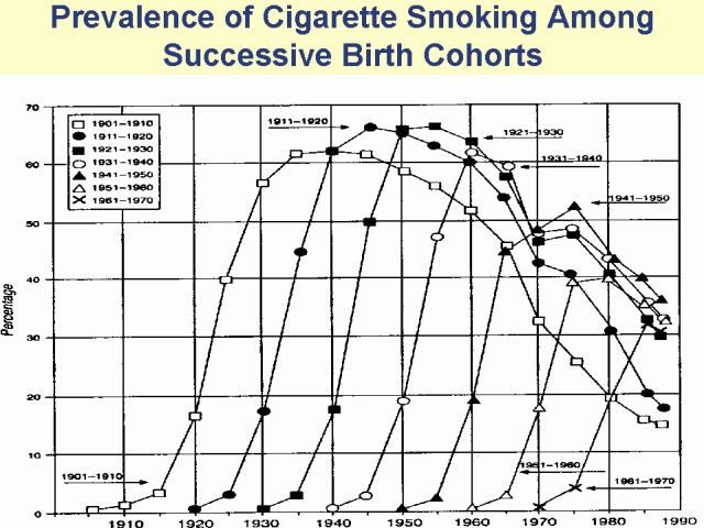 | Changes in prevalence of cigarette smoking among successive birth cohorts of US men, 1900-1987. Source: Reprinted from Strategies To Control Tobacco Use in the United States: A Blueprint for Public Health Action in the 1990s. p. 82, National Cancer Institute, National Institutes of Health, Publication No. 92-3316, 1992. |