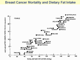 | Ecologic correlation of breast cancer mortality and dietary fat intake. Source: Reprinted from Carroll, K.K., Experimental Evidence of Dietary Factors and Hormone-Dependent Cancers, Cancer Research, Vol. 35, p.3379, with permission of Waverly Press, Inc., © 1975. |