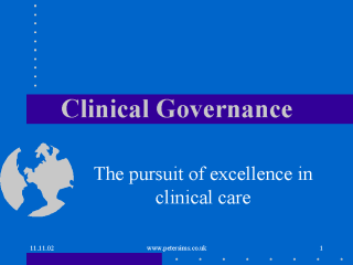 Governance is not new…….in a sense it has been part of Medicine since Hippocrates. “To cure sometimes, to relieve often and to comfort always”. The recent emphasis is an attempt to bring the different strands together. i.e. Audit, Research, Quality, Education and Research and to knit them together for the whole is greater than the sum of its parts. |
