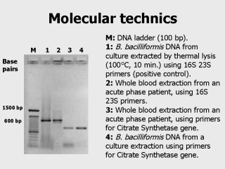 16S-23S ISR or the primers for Citrate Synthase gen. A recent investigation about genotypes of Bartonella bacilliformis through AFLP analysis showed 6 genotypes Birtles R, Fry N, Ventosilla P, Caceres A, Sanchez E, Vizcarra H, Raoult D. Identification of Bartonella bacilliformis genotypes and their relevance to epidemiological investigations of human bartonellosis. J Clin Microbiol 2002; 40:3606-12 Ventosilla P, López M, Antúnez de Mayolo A, Guerra H, Merello J, Pérez E, Maguiña C, Montoya M. Bartonella bacilliformis en el Valle Sagrado Cusco, Perú 1998: Aislamiento e identificación por PCR e IFI. X Jornadas Científicas Homero Silva Díaz, 1998: 47 |