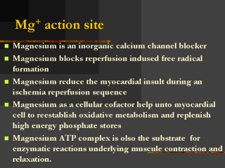 to be involved in inhibition of Ca2+ current by extracellular Mg2+: Mg2+ and Ischemic-Reperfusion Injury studies in the 1970s showed that myocardial ischemia followed by reperfusion results in cytoplasmic Ca2+ overload. There is now general agreement that during and after periods of ischemia, transmembrane Ca2+ influx occurs by several routes, and that cytoprotective agents, including Mg2+, attenuate the increase in intracellular Ca2+ via multiple mechanisms. |