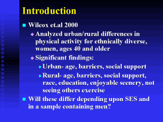 A recent study by Sara Wilcox at the University of South Carolina-Columbia (in conjunction with Stanford School of Medicine and the Prevention Research Center at SLU) analyzed urban/rural differences in physical activity in older women through a cross-sectional study