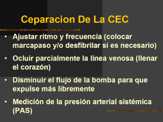para la separación de la CEC debe corroborase: Datos de laboratorio. Hematócrito, potasio, glucosa sanguínea, calcio, gases arteriales, magnesio. Anestesia. Oxígeno al 100%, cerrar vaporizadores, empezar ventilación al despinzar aorta, asesorar distensibilidad pulmonar, integridad de pleuras, succión de la vía aérea sí es necesario. Monitor. Completar recalentamiento a 37°C nasofaríngea o 34-35 °C rectal, frecuencia cardíaca, ritmo cardíaco, observar cambios en el segmento ST, calibrar los transductores a 0 y lavarlos, observar la presión arterial, llenado ventricular, así mismo ver oximetría y capnografía. Paciente. Retirar al paciente de la CEC dependiendo del estado previo del paciente, Esto se hace generalmente dependiendo de la hemodinamia y de restaurar los factores que determinan el gasto cardiaco (ritmo, frecuencia, precarga, postcarga y, contractilidad). Apoyo. Tener disponibles drogas cardioactivas o vasoactivas dentro de la sala de operaciones. |