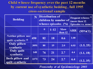 household resident number. * Test for trend across exposure categories: - refers to the linear increase in risk if none; one, or two synthetic items were used ( for frequent wheeze, p=0.004) + Reference categoryIn the cross-sectional sample, there was a significant trend for increased likelihood of frequent wheeze with increased amounts of synthetic bedding. Synthetic bedding was associated with increased frequent when compared to feather bedding (aRR=1.7 (1.1-2.4) but not other non-feather bedding (aRR=1.2 (0.7, 2.1). However, feather bedding was very uncommon in infancy, so could not explain the adverse effect of infant synthetic pillow use. |