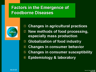 | 4. Changes in consumer behavior e.g. dietary changes, increased consumption of food in commercial food establishments 5. Changes in consumer susceptibility to foodborne disease I.e. increasing number of immunocompromised people (HIV, aging population, use of immunosuppressive agents, etc.) 6. Epi & lab I.e. new detection & identification methods & studies . |