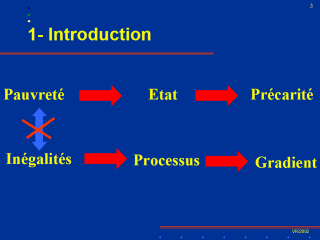 La pauvreté est un état qui se concrétise souvent pas l’exclusion sociale et la précarité. Les inégalités sont la résultante d’un processus social qui se concrétise par l’existence de gradient concernant les résultats de santé en fonction de sous-groupes sociaux. Ces deux concepts peuvent être résumés par les deux diapositives suivantes. |