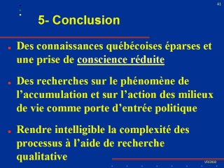 l’indifférence ou du déni. Á la lumière des écrits étudiés, il nous semble qu’une attention particulière devrait être portée à la question du cumul des inégalités sociales tout au long du parcours de vie, ayant comme conséquences des résultats de santé différenciés. Tout se passe comme si le fait d’être dans une situation sociale défavorable ne faisait que renforcer l’apparition ou la présence de facteurs néfastes pour la santé des individus. L’inverse étant aussi vrai. L’étude approfondie des informations scientifiques québécoises ou internationales eu égard à la question des inégalités sociales de santé révèle que les connaissances en construction sont essentiellement d’ordres quantitatif et épidémiologique. Ce point de passage était obligatoire tant il demeure encore essentiel d’user de chiffres pour convaincre les décideurs et la communauté scientifique que les inégalités de santé ne sont pas naturelles. Cependant, nous voudrions préciser qu’il est peut être temps, maintenant, d’entrer dans la complexité des interactions et d’avancer dans l’élucidation des processus sociaux et politiques aboutissant aux résultats de santé différents, aujourd’hui bien explicités. |