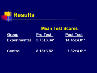 pre-test score compared to the control group (p = 0.040) **Experimental group significantly improved from pre- and post-test (p = 0.0001) *** Experimental group had significantly higher scores at post-test compared to the control group (p = 0.0001)