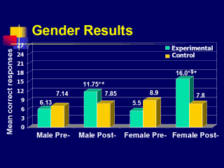 post-test compared to control group (p = 0.001) $ Experimental females had a greater improvement pre- to post-test than the experimental males (p = 0.060)+ Improvements were not significant between gender with both groups combined (p = 0.554) |