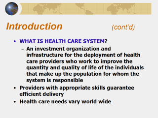 | Throughout the world people's health care needs vary widely. But it is a right to have an accessible health care system in a country, to every one, every community. The Health Care System is defined, as an investment, organization, and infrastructure for the deployment of health care providers who work to improve the quantity and quality of life of the individuals that make up the population for whom the system is responsible. The delivery of such services requires a wide range of providers with appropriate skills. |