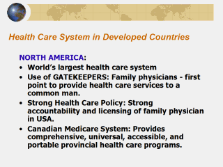 the community according to their needs. Family physicians (general practitioners) are called as gatekeepers and are first point to provide health care services to a common man. In spite of insurance problems in United States (market driven) health care policy is in place with strong accountability and licensing of family physician. Most of the problems are handled at family physicians level, and if needed are referred to specialists. Strong Medicare of Canada provides comprehensive, universal, accessible, and portable provincial health care programs. |