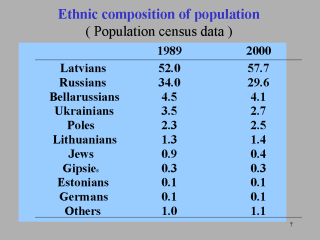 Latvia consisted of 77 % of Latvians and only 8.8 % of Russians. Post-war deportations, particularly of Latvians, and immigration of newcomers from other Soviet republics had a substantial impact on the ethnic situation in Latvia. Latvia distinguished among European states by very high immigration rate and proportion of its foreign-born populations. The proportion of Latvians in the total population had decreased from 62 % to 52 % in 1989. In the 1990s the changes in the ethnic composition are another character. For the first time the proportion of Latvians tends to increase gradually ( 57.6 % according to the 2000 census ) but the amount and the proportion of Russians, Belarussians, Ukrainians decrease. |