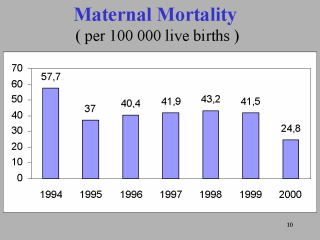 | In 2000 for the first time since 1995 the maternal mortality has decreased. If since 1995 in Latvia 8 women died during pregnancy, childbirth or puerperium each year, then in 2000 - 5 women only, 2 of them - outside the hospital. The main reasons of death are: abortions ( included illegal ), sepsis after abortion, embolism amniotic fluid, phlebotrombosis and hemorrhage. |