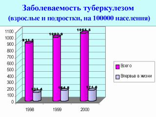 недуга, как и во многих других государствах. На фоне роста заболеваемости значительно чаще стали регистрироваться тяжелые, комбинированные, прогрессирующие формы туберкулеза с мультирезистентностью к противотуберкулезным препаратам, часто приводящие к летальному исходу (туберкулезный менингит, казеозная пневмония, миллиарный туберкулез). Смертность от туберкулеза возросла с 1991 по 1998 годы в 2.7 раза (с 7.8 до 18.3 на 100 000 жителей). |