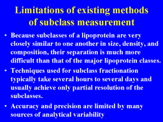 and quantification. Techniques most frequently used for subclass fractionation include various types of ultracentrifugation, electrophoresis, chemical precipitation, and chromatography. Otvos JD, Measurement of lipoprotein subclass profiles by nuclear magnetic resonance spectroscopy. In: Handbook of Lipoprotein Testing. Rifain N, Warnick R, Dominiczak M eds. Washington DC: AACC Press 1997. |