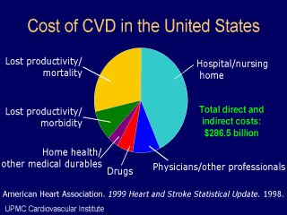 direct and indirect cost of CVD in the United States. In addition to the high cost in human lives, CVD imposes a heavy economic burden as the number one cause of health care expenditures. A total of $178.2 billion annually is spent on direct costs for hospitals and nursing homes, physicians and other professionals, drugs, and home health and other medical durables, and the inclusion of indirect costs associated with lost productivity due to morbidity and mortality increases the total to $286.5 billion each year. Physician reimbursement and drug costs account for relatively small proportions of this total. Reference: American Heart Association. 1999 Heart and Stroke Statistical Update. Dallas, Texas: American Heart Association, 1998. Economic Cost of Cardiovascular Diseases, 2001 Heart and Stroke Statistical Update |