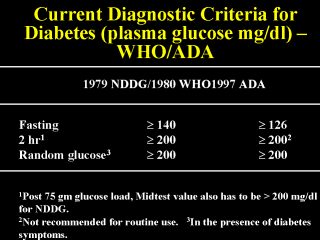 | American Diabetes Association (ADA) in 1979 introduced new criteria for definition of Diabetes and Impaired Glucose Tolerance (IGT) with the use of 75 gm glucose load. World Health Organization (1985) criteria was not much differ from ADA (1979) ones. |