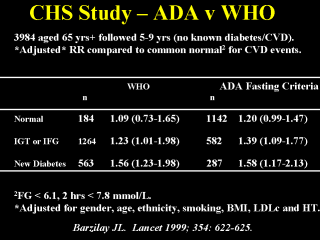 | Let’s see how these changes in criteria influence to Cardiovascular Diseases (CVD). Here is comparison of WHO and ADA criteria in terms of CVD Risk. ADA criteria was not able to identify a lots number of people with increased CVD Risk. |