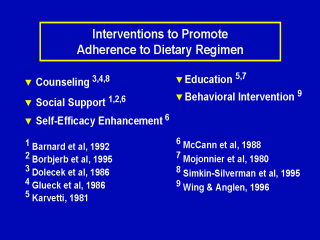 | Similarly in the dietary area: counseling, social support, self-efficacy, education, and the more self-management oriented behavioral strategies. |